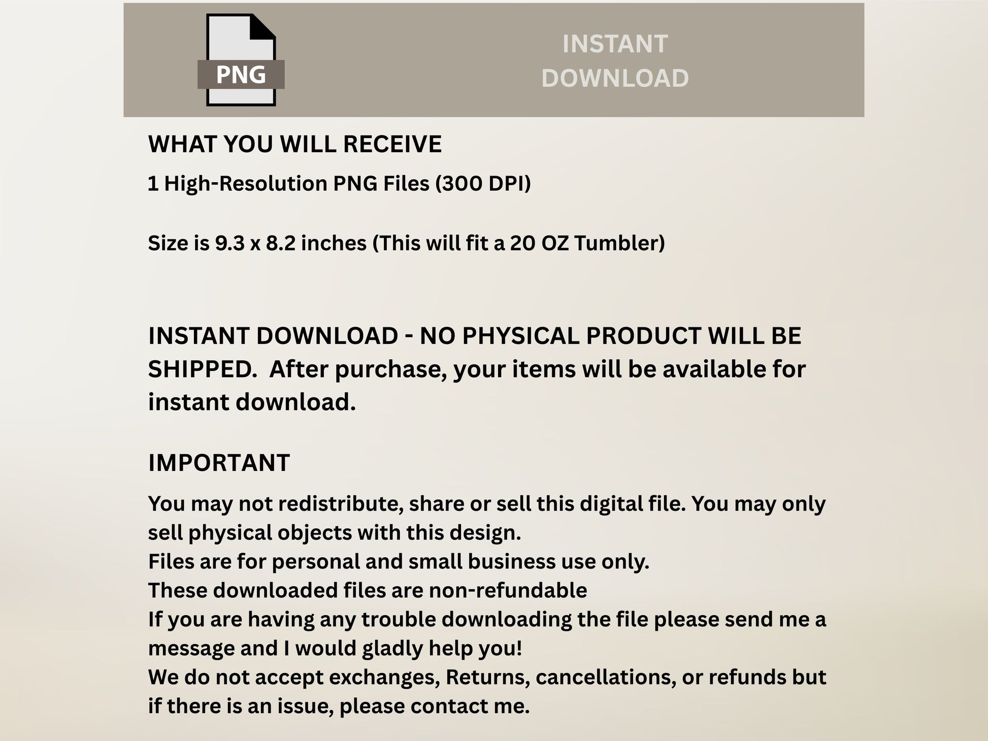 Instant download items don’t accept returns, exchanges or cancellations. Please contact the seller about any problems with your order.