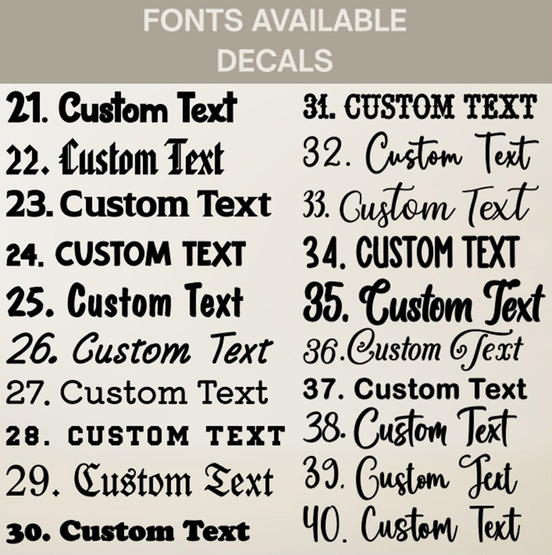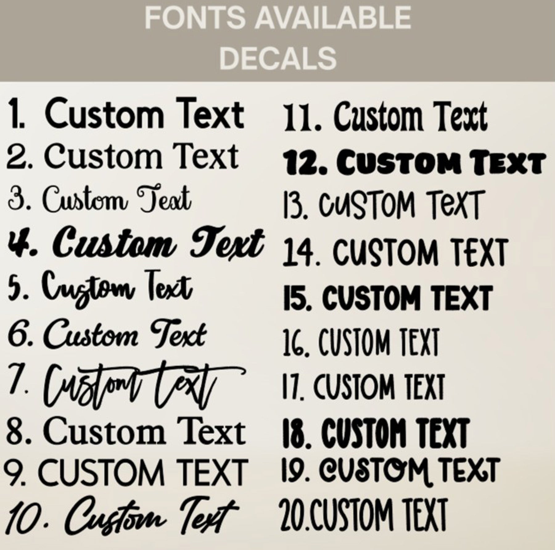 *** FONT and PERSONALIZATION can be added under special instructions section. Name, font, and color. Choose your Font from the charts in the images. Specify color of Name if different from the image shown. Please type the name exactly as you would like it to appear. If no font is chosen, we will create your decal in the font shown on the decal.